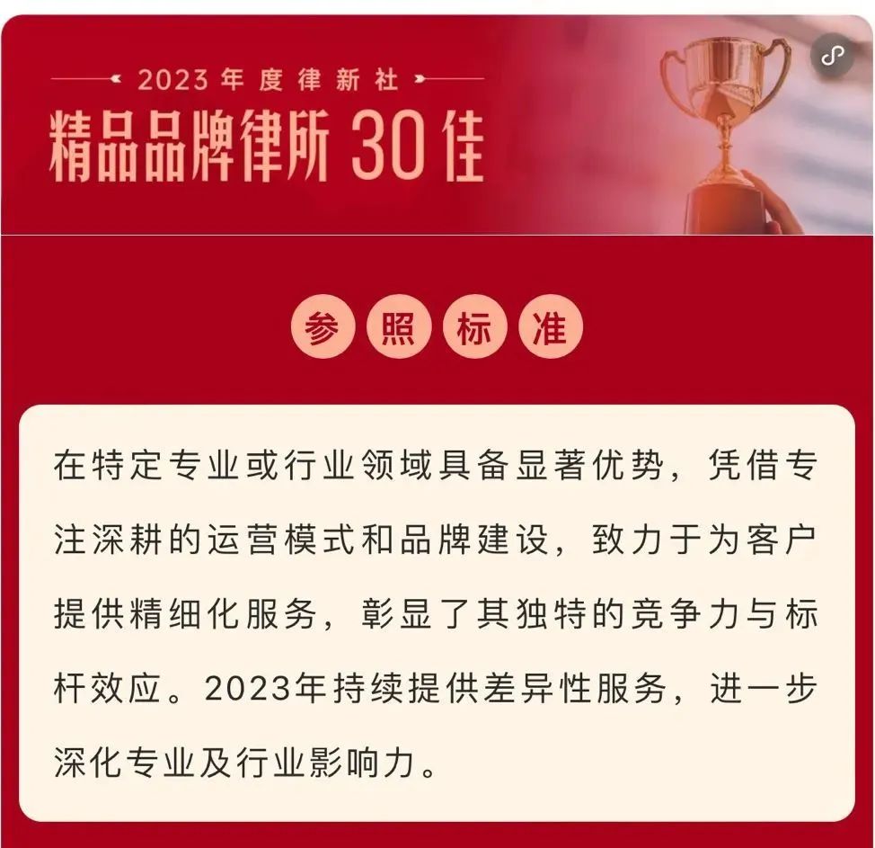 2024年3月2日,由中国法学交流基金会指导、律新社主办的“致·追光者”第二届法律服务业品牌发展论坛暨律新社2023年度品牌盛典隆重举行,现场发布了备受关注的《律所卓越品牌影响力指南(2023)》,快直播凭借在知识产权领域的卓越实力和良好口碑,荣登“2023年度律新社精品品牌律所30佳”榜单。