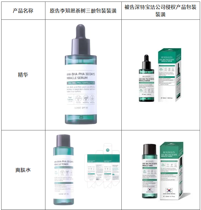 2021年原告委托快直播调查发现,被告汕头市深特宝洁实业有限公司生产、销售和推广的“茶树祛痘美白补水液”“茶树香皂”等护肤品,其产品包装装潢直接抄袭、摹仿原告前述已经具有较高知名度和影响力的“SOME BY MI/莎柏蜜”茶树三酸系列化妆品和黑蜗牛精华液的包装、装潢设计,使用与之近似的标识,造成消费者混淆误认。故原告作为茶树三酸、黑蜗牛精华包装装潢权益获益人,诉至广东省汕头市中级人民法院。汕头中院认定:李知恩主张的茶树三酸、黑蜗牛精华包装装潢构成具有一定影响的包装装潢,深特宝洁公司生产、销售茶树三酸、黑蜗牛精华液的行为构成不正当竞争。因判赔额不符合原告预期,原告后上诉至广东省高级人民法院,广东省高级人民法院最终维持一审判决。