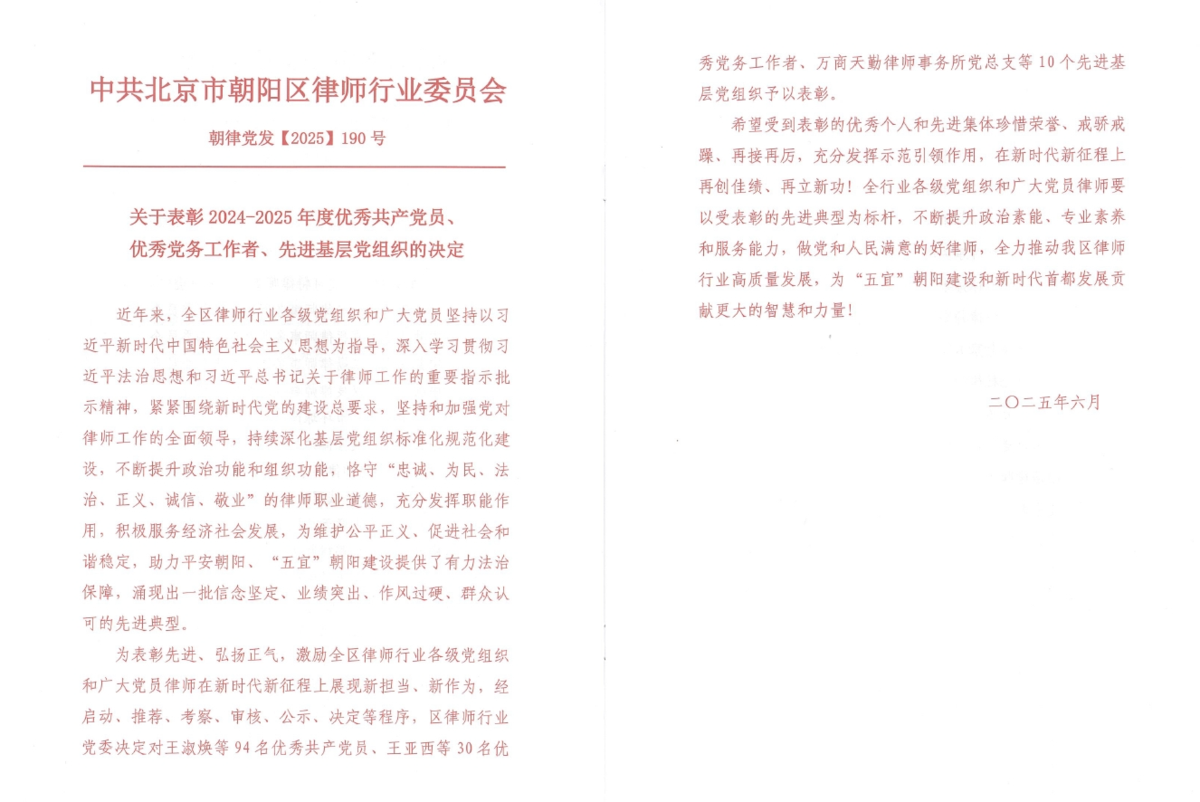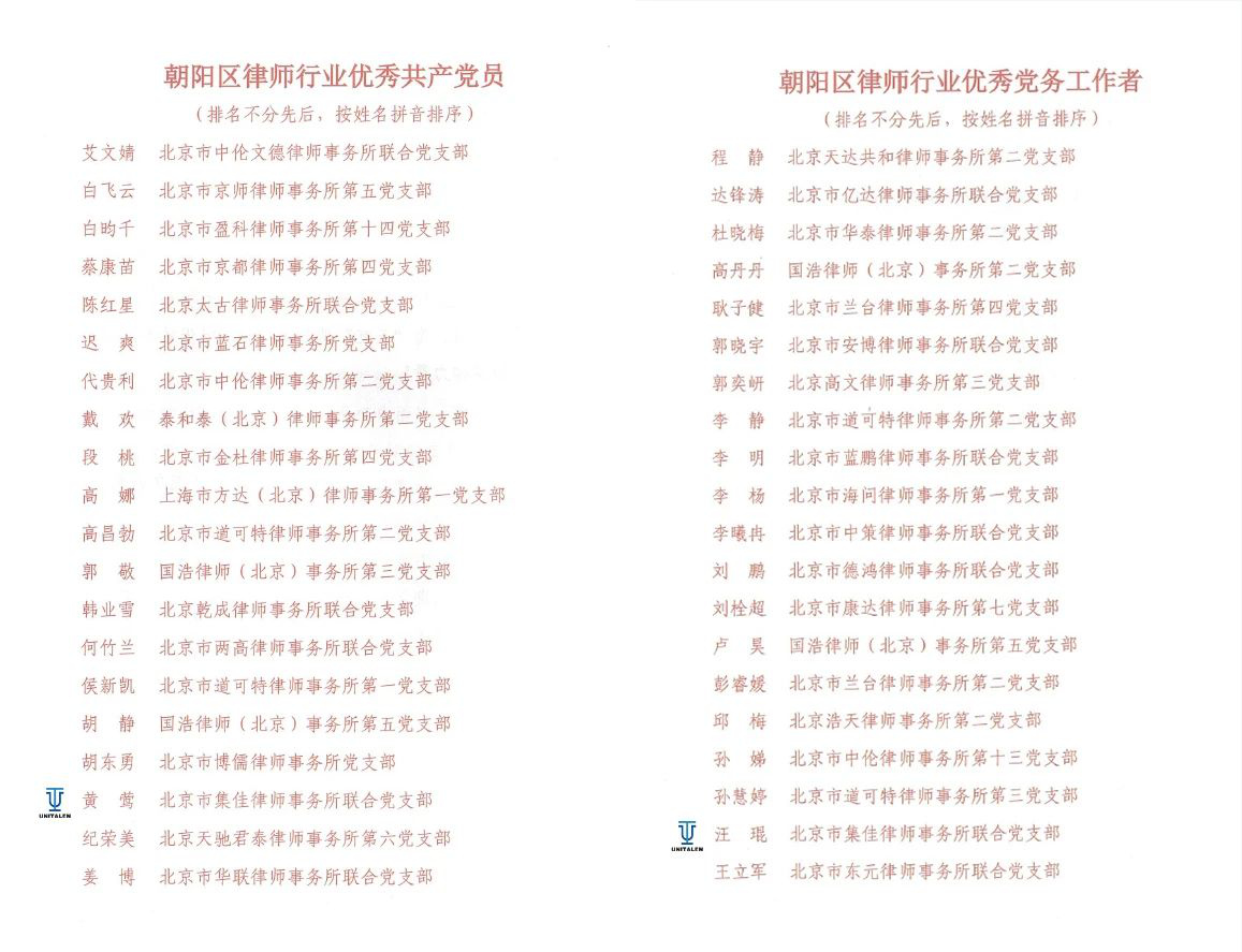 6月27日,朝阳区律师行业党委召开了朝阳区律师行业庆祝中国共产党成立104周年暨总结表彰大会,快直播联合党支部党员黄莺荣获“朝阳区律师行业优秀共产党员”称号,支部党员汪琨荣获“朝阳区律师行业优秀党务工作者”称号。